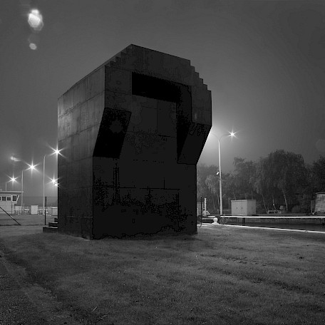 Feeling their way through the darkness, visitors can ascend to the top of the structure via stairs, where a bench awaits them. Sitting there—having first been temporarily blinded by the intense outdoor light streaming through the opening—they can take in the view of the canal, as well as the tranquility of its long, straight waterline. This canal, once heavily trafficked in the twentieth century, played a significant role during the war and functioned in West Flanders not only as a passageway but also as a kind of border.